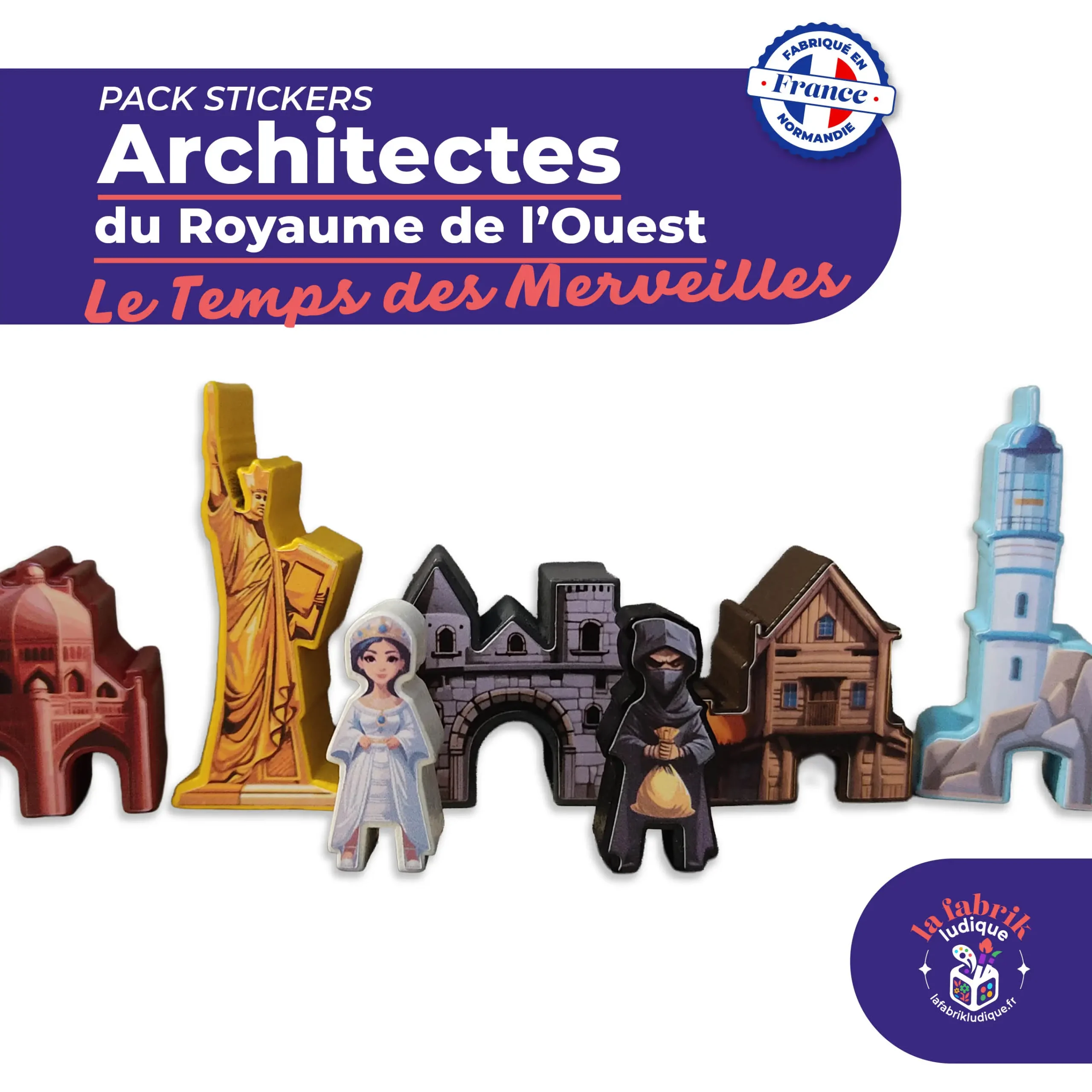 Habillez vos meeples grâce à notre pack de stickers compatible pour l’extension du jeu Architectes du Royaume de l’Ouest : Le temps des Merveilles !