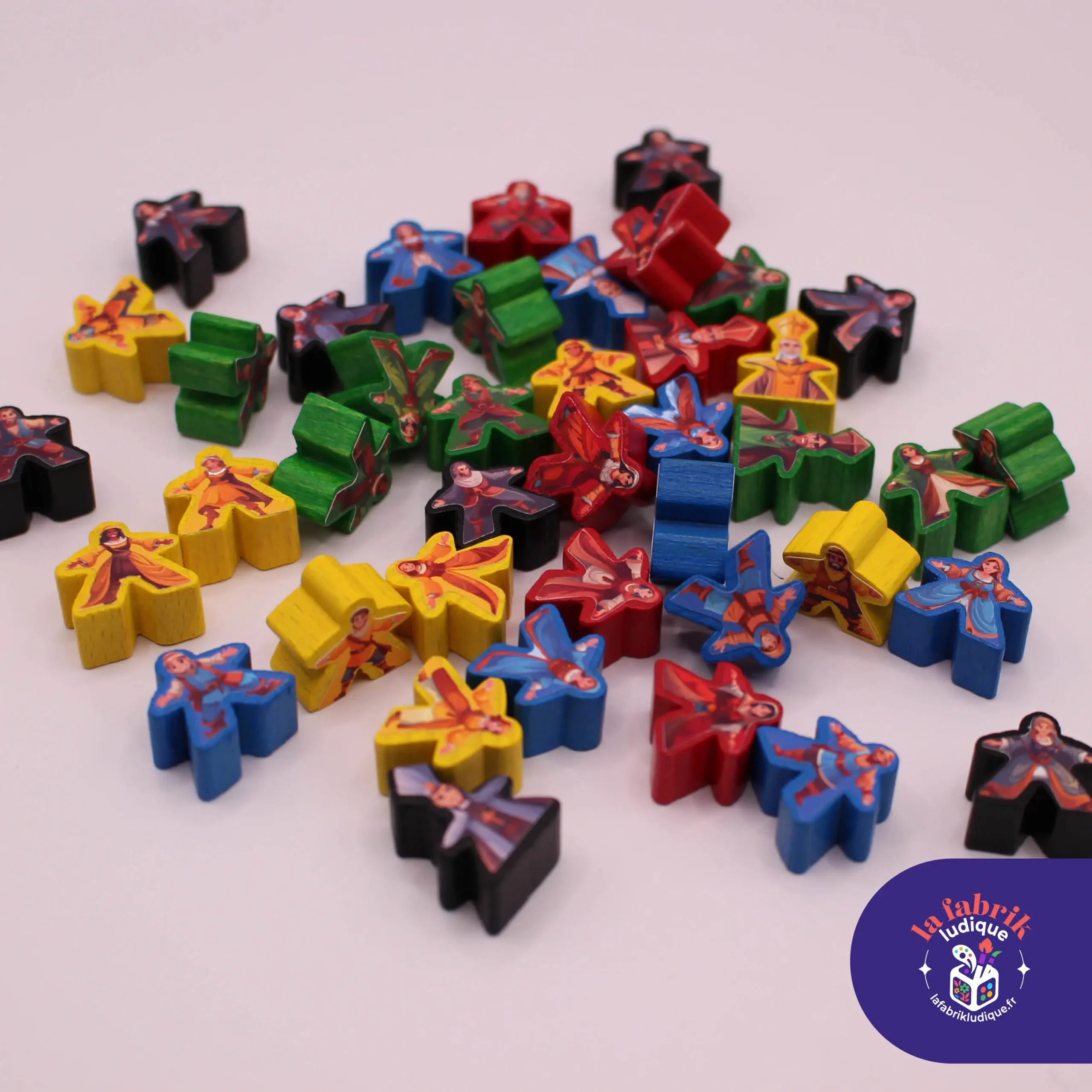 Les illustrations sont en partie réalisées à l’aide de l’IA générative, puis ajustées et retravaillées par «La Fabrik Ludique» afin d’obtenir un meilleur rendu sur les meeples.