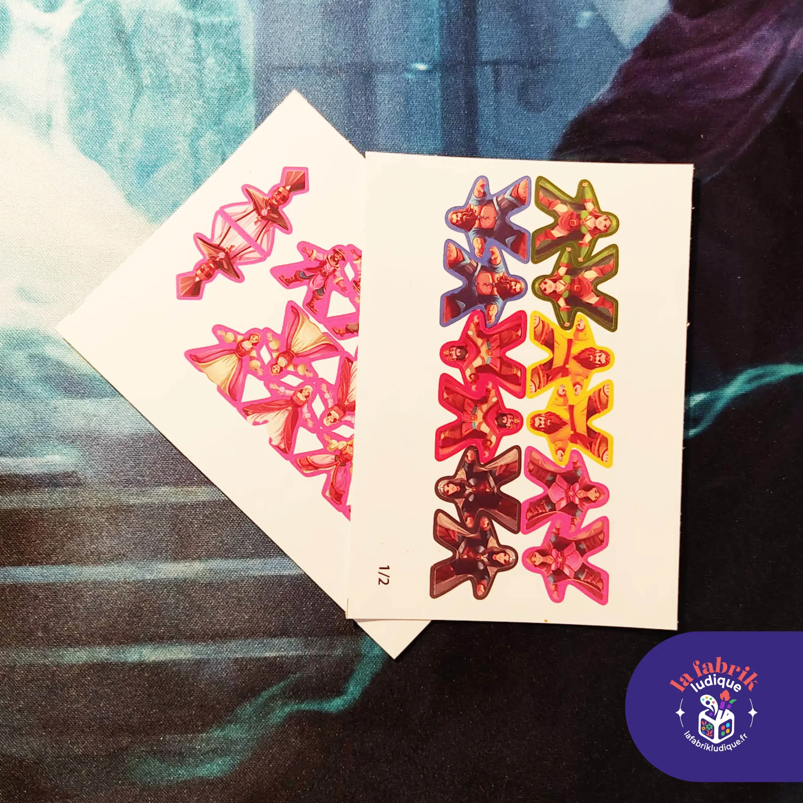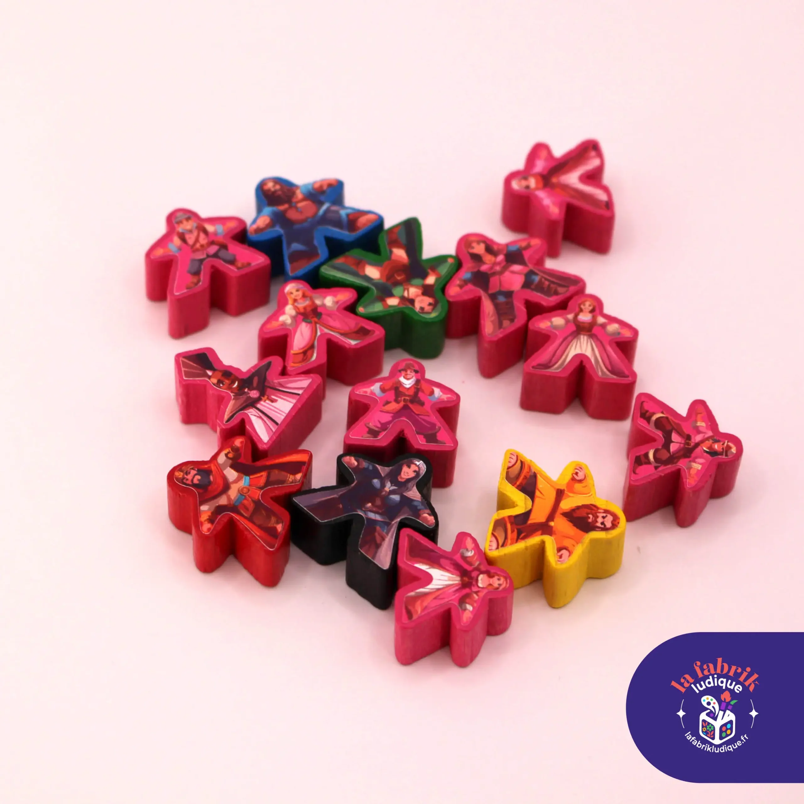 Stickers recto/verso pour vos grands meeples et les meeples rose du 6e joueur.