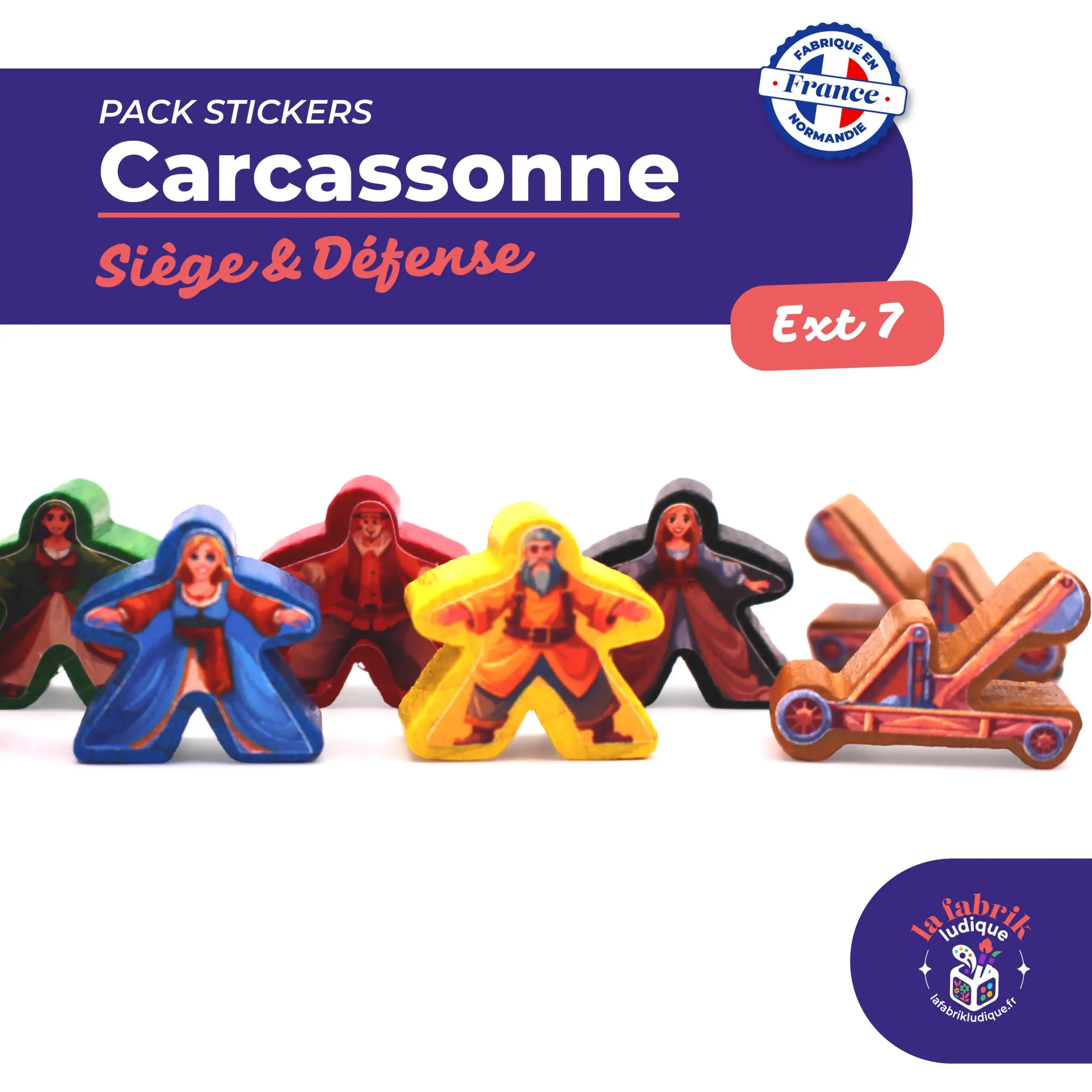 Habillez vos meeples grâce à notre pack de stickers pour l’extension 7 du jeu Carcassonne : Siège et Défense (extension 7) !