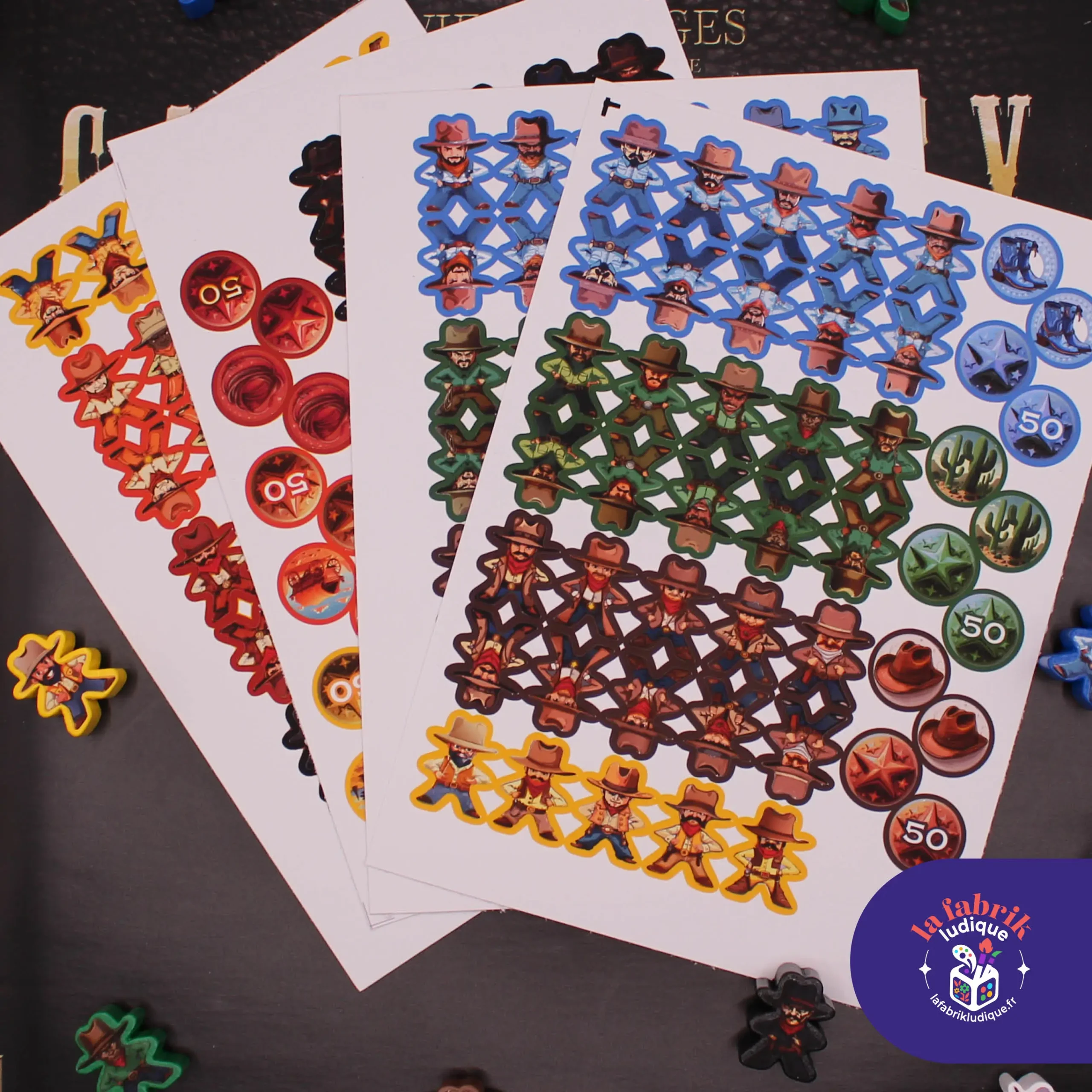 • Stickers recto/verso pour vos cowboys, shérif et bandis ainsi pions de victoire et tour