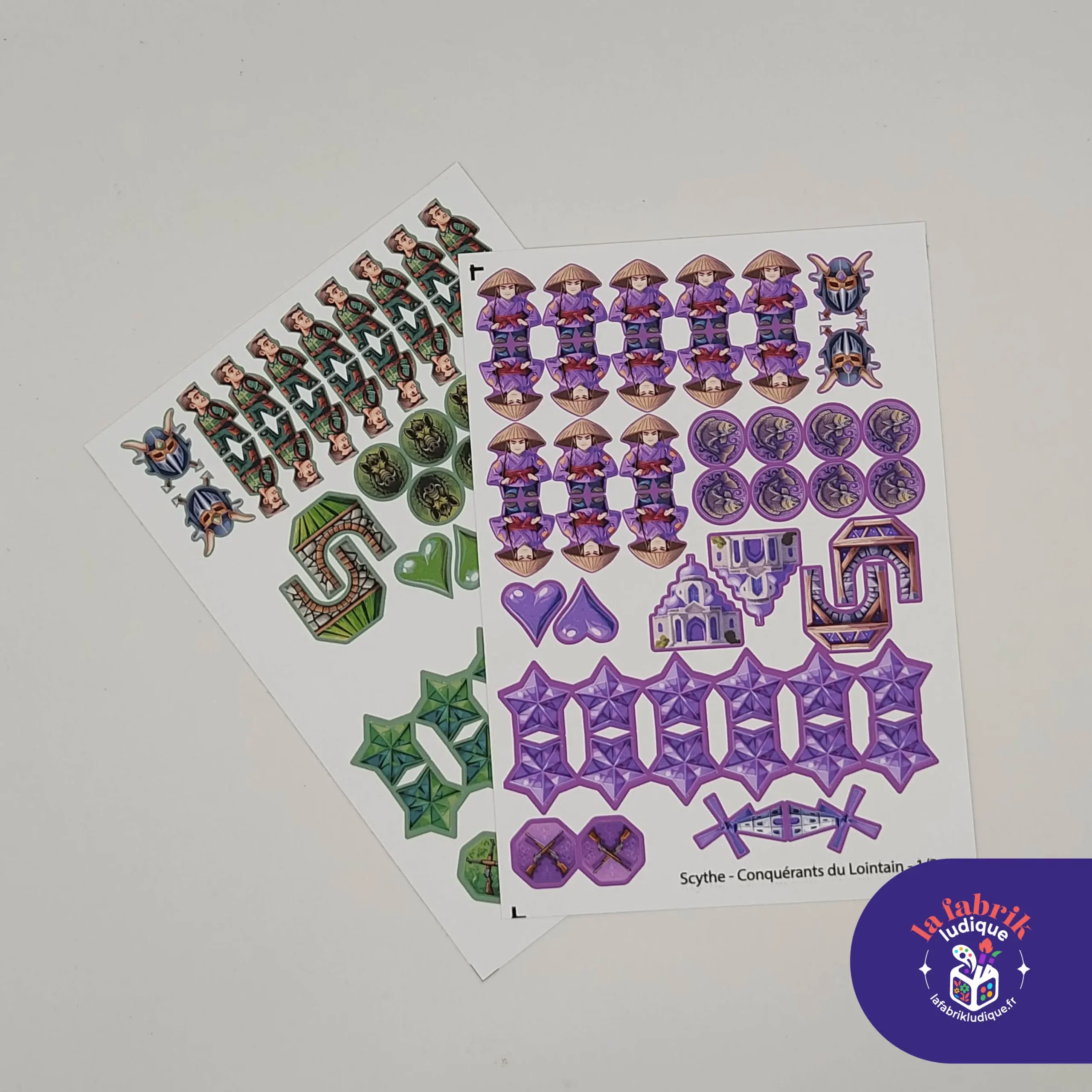 Habillez vos meeples grâce à notre pack de stickers compatible avec l’extension du jeu Scythe : Conquérants du Lointain (pack non officiel) !