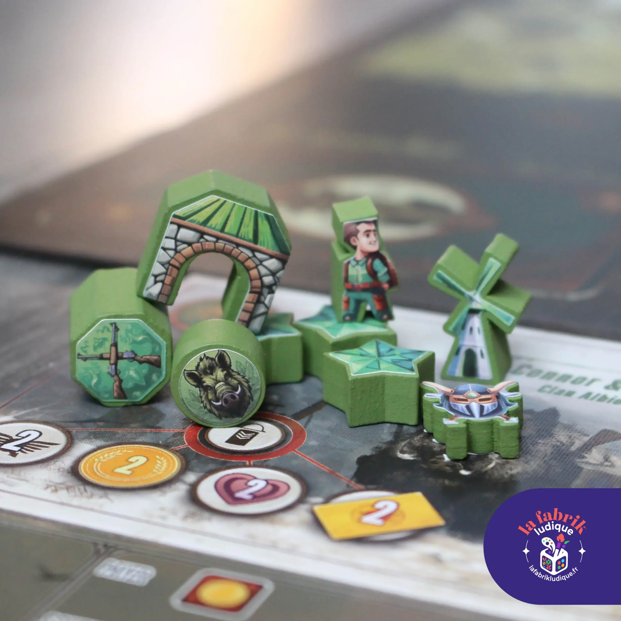 Les illustrations sont en partie réalisées à l’aide de l’IA générative, puis ajustées et retravaillées par «La Fabrik Ludique» afin d’obtenir un meilleur rendu sur les meeples.